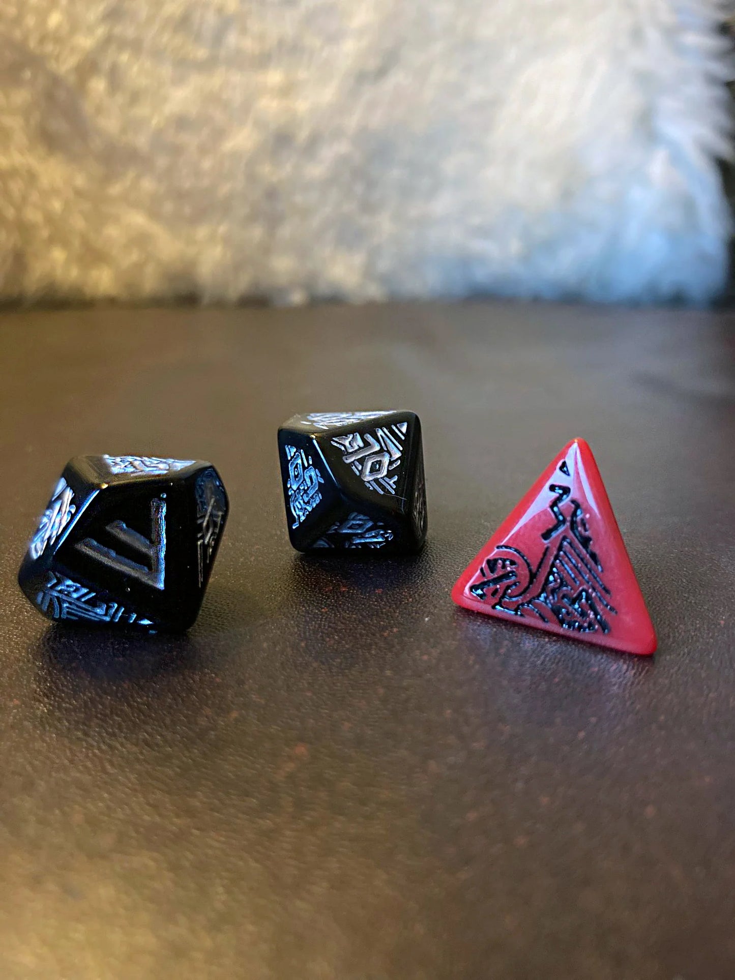 Flotte spesialproduserte terninger til rollespillet Kvad. Kommer i egen kvalitetspose av kunstlær med Kvad-logo, og inneholder følgende terninger: