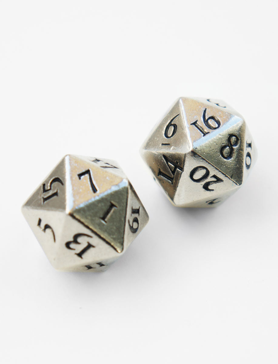 To 20-sidige terninger i metall med sinklegering. Kromfinnishen har et antikkutseende og veier 29 gram hver. Perfekt til rollespill og som livsteller i for eksempel Magic: The Gathering.